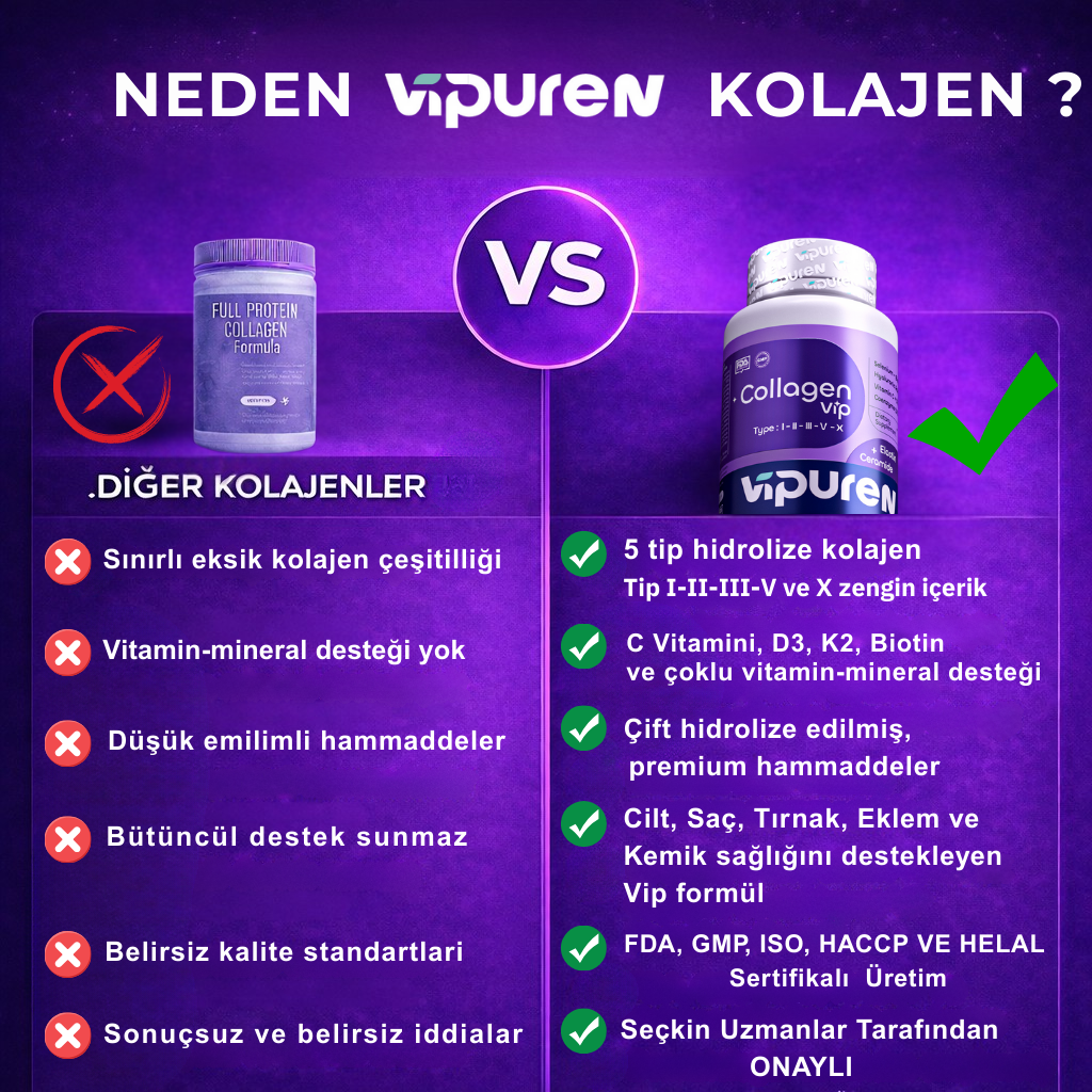 CollagenVip'i 11 yaş ve üzeri bireyler için uygundur. Cilt, saç, tırnak, eklem ve bağ dokusu sağlığını desteklemek, yaşlanma belirtilerini geciktirmek ve bağışıklığı güçlendirmek isteyen herkes kullanabilir.